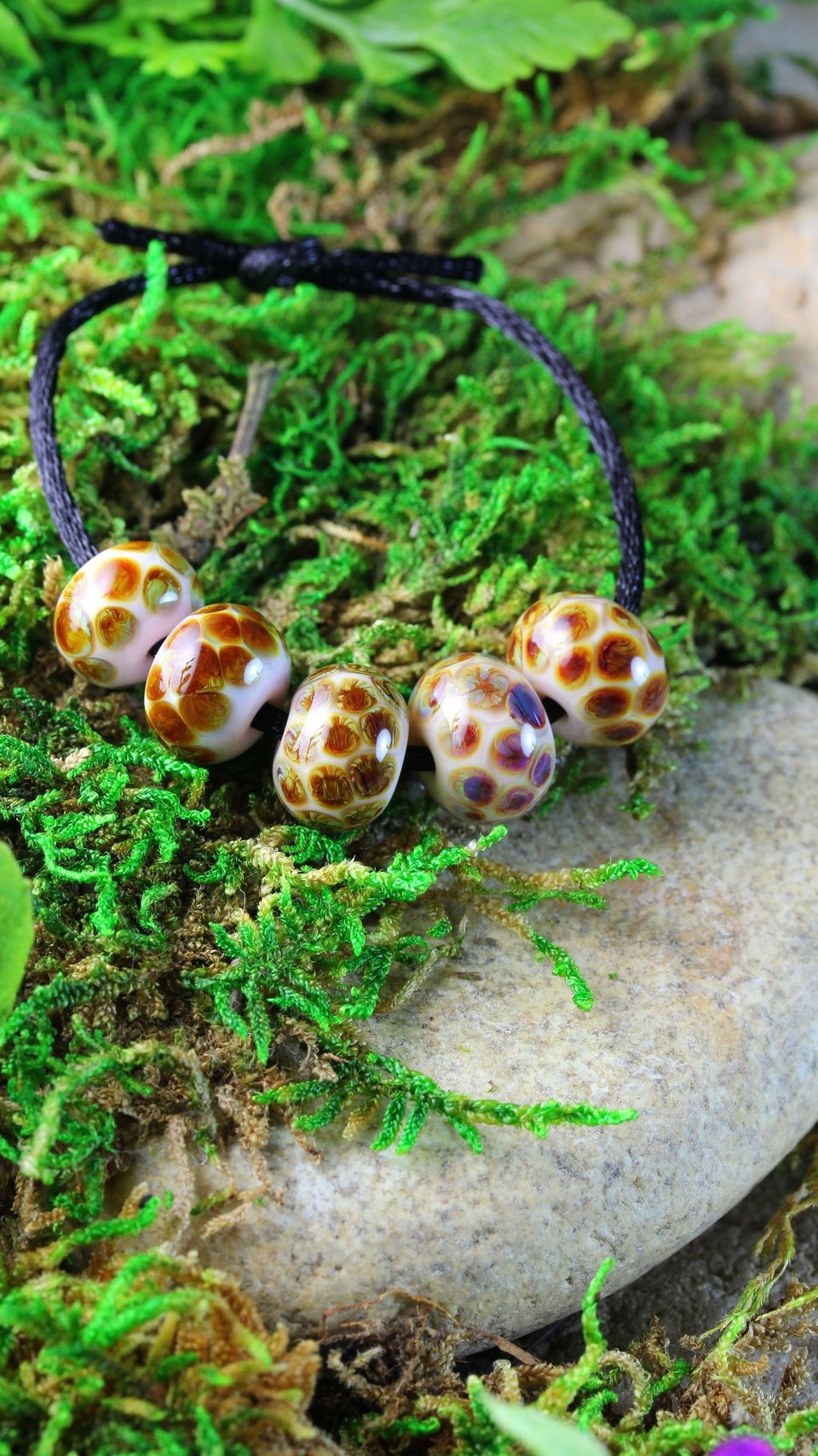 These 5 beads are soft, effetre moretti glass. The base color of the beads is a soft pink and features brown polka dots that change colors in the light. Each bead is a slightly different version of the same pattern. Each size is a little different.