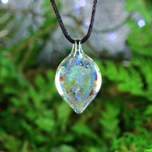 This lampwork implosion pendant necklace is made using borosilicate / boro glass. The gray flower implosion is nestled in a bed of greens and blues and clear. The bale is clear.