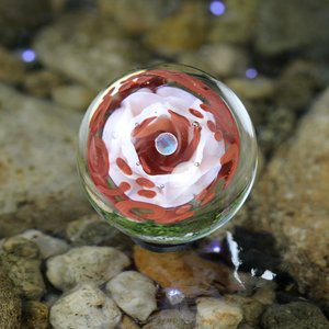 This handmade lampwork marble is made out of borosilicate / boro glass. There is a clear opal orb floating in the middle of a pink flower with earthy red vines around the flower.